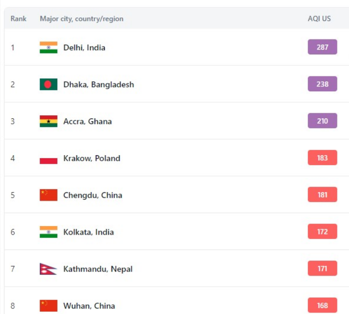 Delhi, the capital of India, maintains its notorious position as the most polluted city globally, closely trailed by Dhaka, the capital of Bangladesh.