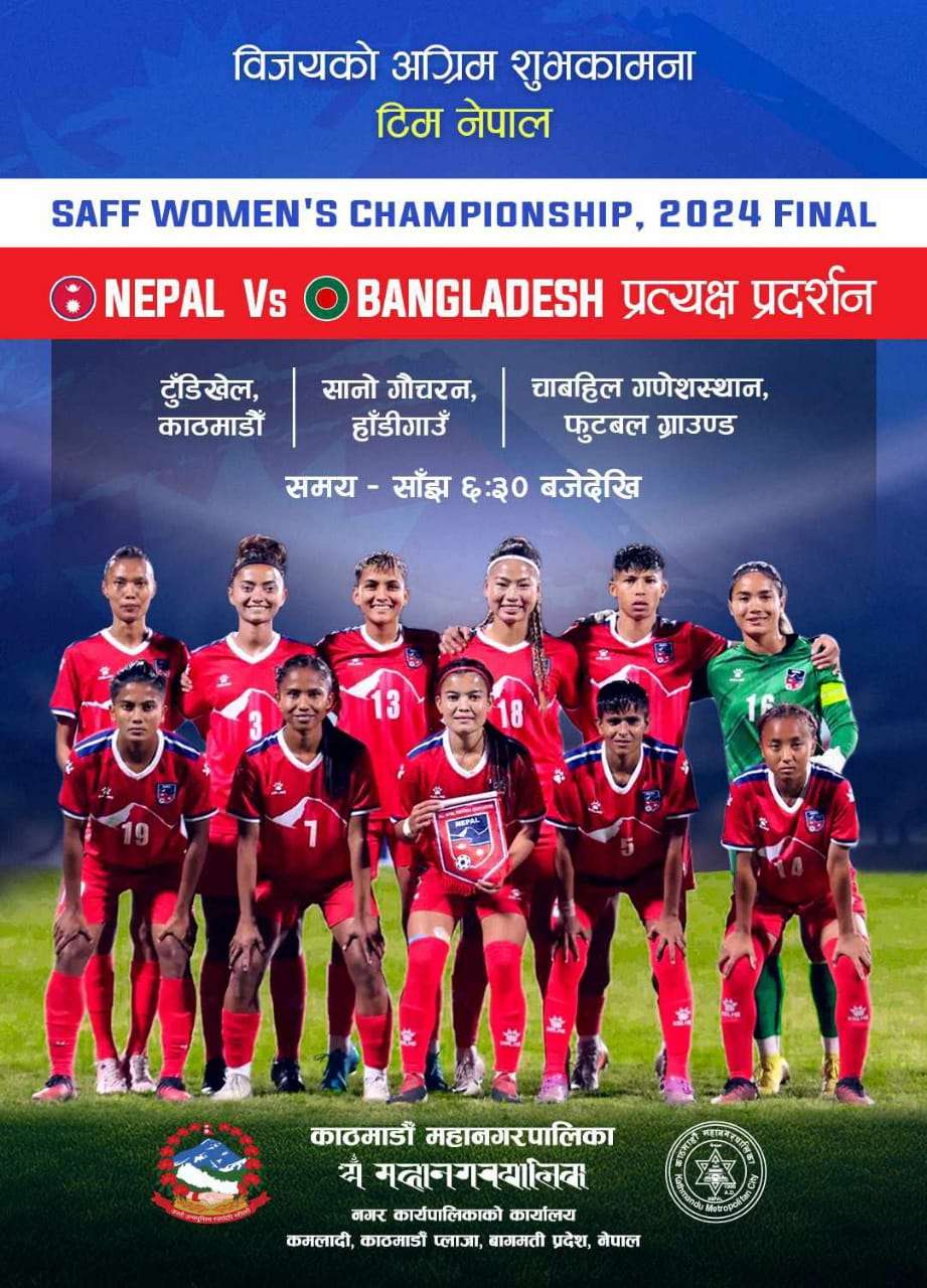 साफ वुमन्स च्याम्पियनसिप २०२४ को उपाधीका लागि आज हुने नेपाल र बंगालादेशबीचको खेल काठमाडौं महानगरपालिकाले तीन ठाउँमा प्रत्यक्ष प्रसारण गर्ने भएो छ ।