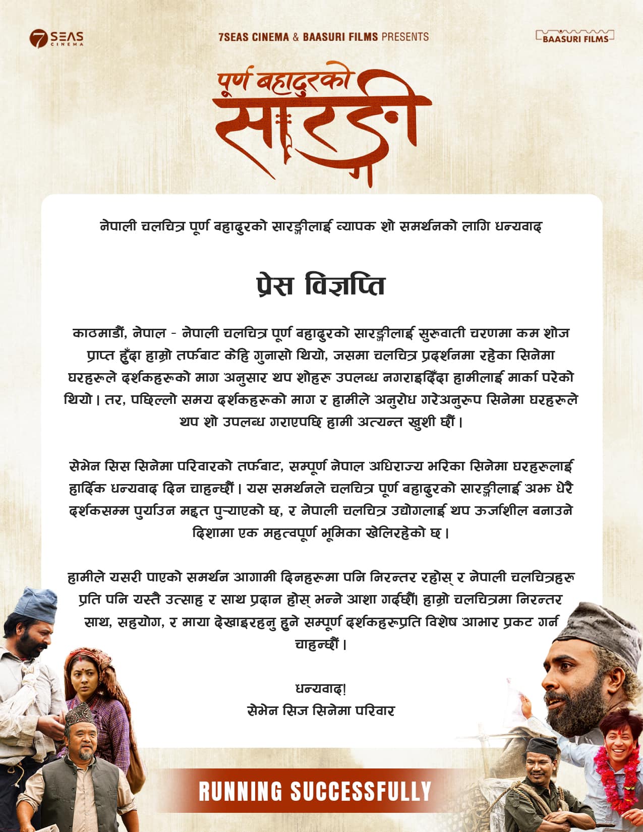 ‘पूर्ण बहादुरको सारङ्गी’ले दर्शकको अभूतपूर्व साथ पाएसँगै केही हलहरुले मध्यरातसम्म शो राख्नुपरेको र धेरै शोहरू ‘फिलिङ फास्ट’ भएको समेत बताएका छन् । चलचित्रको प्राप्त शोमध्ये सबैको अकुपेन्सी ८० देखि १०० प्रतिशतसम्म देखिन्छ ।