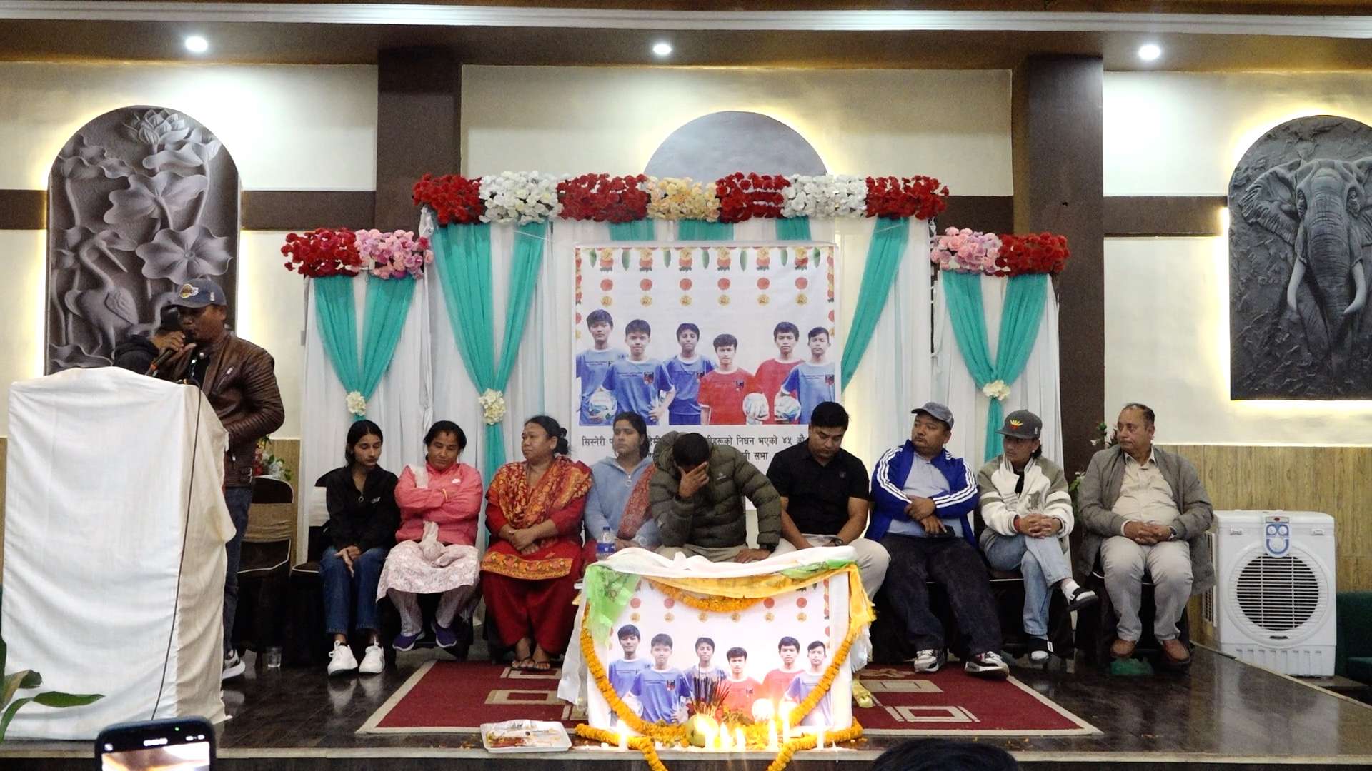 श्रृद्धाञ्जली सभा ‘हाम्रो अभियानः नेपाली फुटबलमा आमुल परिवर्तन’ नामक संस्थाको उपत्यका समन्वय समितिले सिस्नेरी फुटबल एकेडेमीका किशोर खेलाडीहरुको निधन भएको ४५ औं दिनको पुण्यतिथिमा श्रृद्धाञ्जली सभाको आयोजना गरेको छ ।