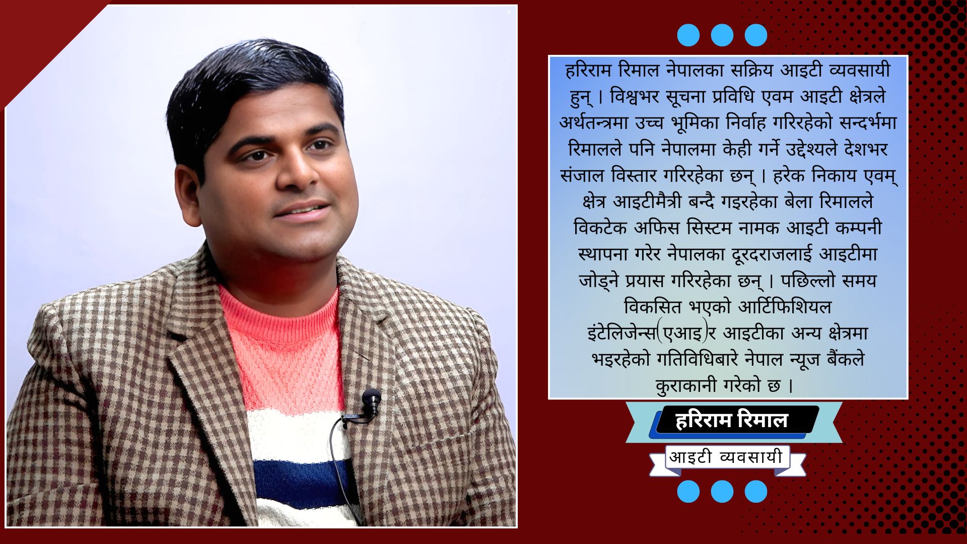 हरिराम रिमाल नेपालका सक्रिय आइटी व्यवसायी हुन् । विश्वभर सूचना प्रविधि एवम आइटी क्षेत्रले अर्थतन्त्रमा उच्च भूमिका निर्वाह गरिरहेको सन्दर्भमा रिमालले पनि नेपालमा केही गर्ने उद्देश्यले देशभर संजाल विस्तार गरिरहेका छन् । हरेक निकाय एवम् क्षेत्र आइटीमैत्री बन्दै गइरहेका बेला रिमालले विकटेक अफिस सिस्टम नामक आइटी कम्पनी स्थापना गरेर नेपालका दूरदराजलाई आइटीमा जोड्ने प्रयास गरिरहेका छन् । पछिल्लो समय विकसित भएको आर्टिफिशियल इंटेलिजेन्स(एआइ)र आइटीका अन्य क्षेत्रमा भइरहेको गतिविधिबारे नेपाल न्यूज बैंकले कुराकानी गरेको छ ।
