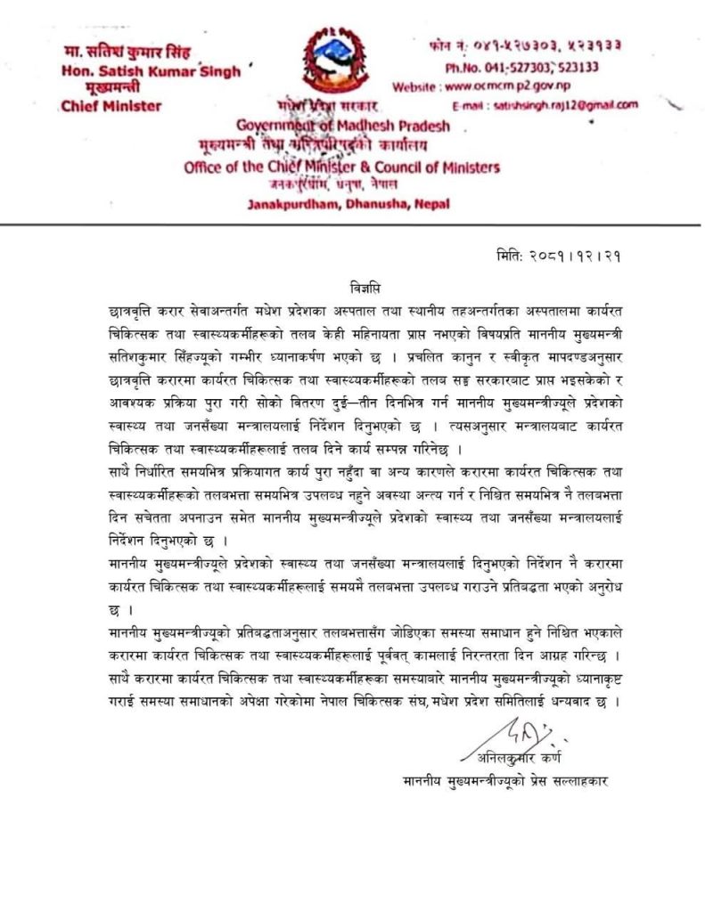 मधेश प्रदेशका अस्पताल तथा स्थानीय तहअन्तर्गत कार्यरत छात्रवृत्ति करार सेवाका चिकित्सक तथा स्वास्थ्यकर्मीहरूको केही महिनादेखि तलब नपाएको विषयमा मुख्यमन्त्री सतिशकुमार सिंहले गम्भीर ध्यानाकर्षण जनाएका छन् ।
