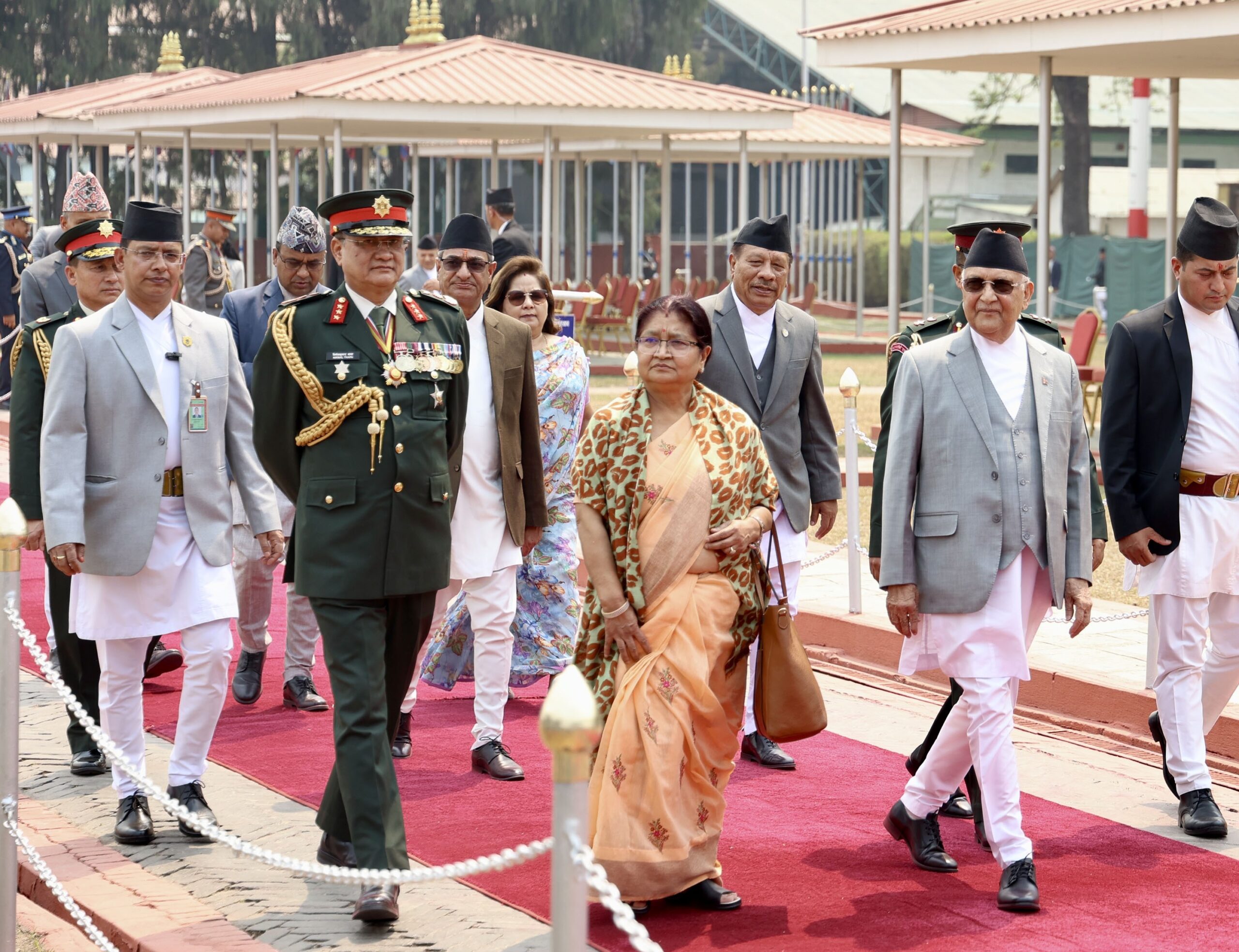 प्रधानमन्त्रीको स्वागतमा नेपालस्थित कूटनीतिक समुदायका डीन, नेपालका लागि इजिप्टका राजदूत तथा थाइल्याण्डका कार्यवाहक राजदूत पनि विमानस्थलमा उपस्थित थिए। स्वागतअघि नेपाली सेनाको एक टुकडीले प्रधानमन्त्रीलाई सम्मान गारत अर्पण गरेको थियो।