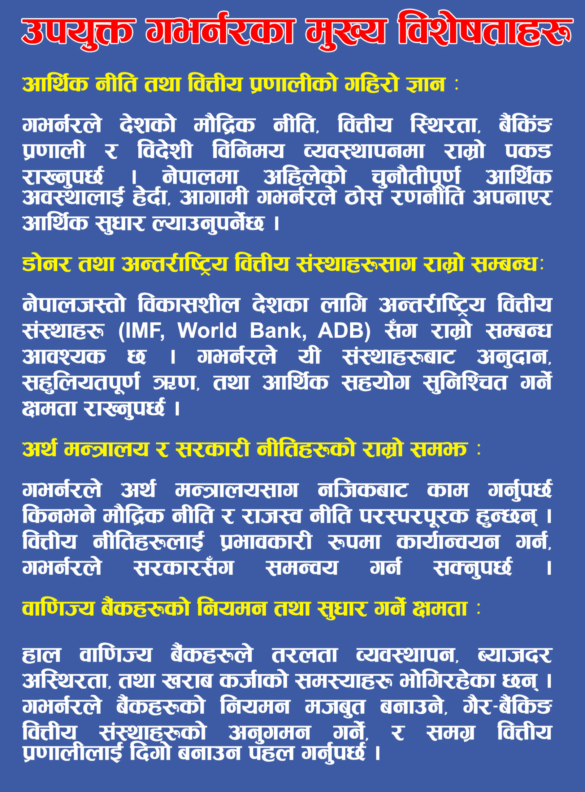 नेपालको अर्थतन्त्रलाई सही दिशामा लैजान सक्ने योग्य व्यक्ति छनोट गर्नु सरकारका लागि महत्त्वपूर्ण निर्णय हुनेछ ।