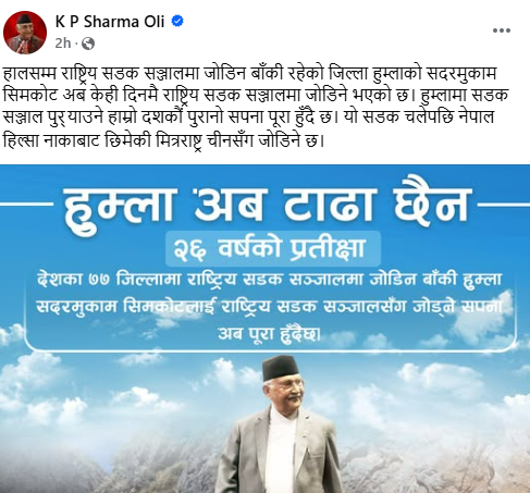 ओलीले आज सामाजिक सञ्जालमार्फत हुम्ला अब टाढा छैन भन्दै हुम्लालाई सडक सञ्जालमा जोड्ने २६ वर्षको प्रतीक्षा पूरा हुन थालेको उल्लेख गरेका हुन् ।