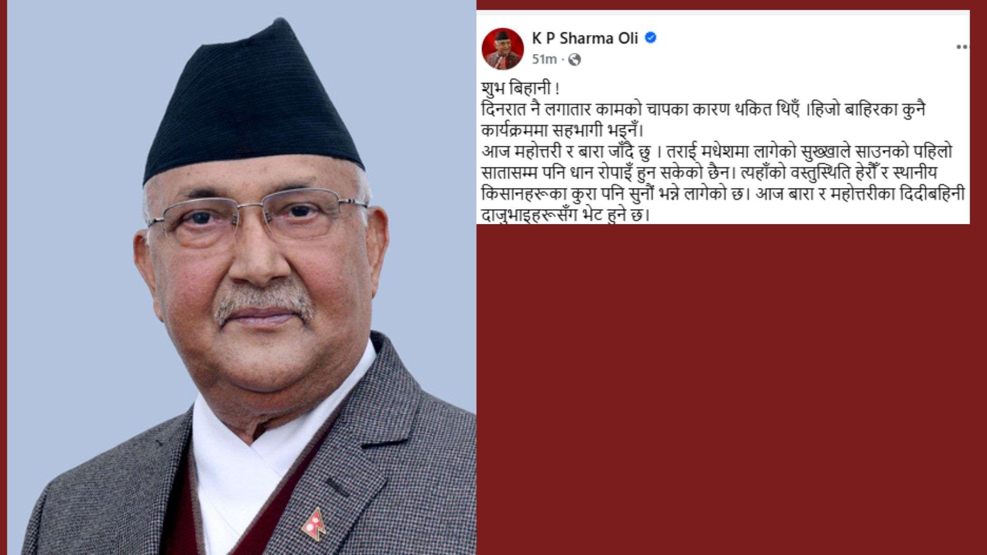 ‘दिनरात नै लगातार कामको चापका कारण थकित थिएँ । हिजो बाहिरका कुनै कार्यक्रममा सहभागी भइनँ,’ प्रधानमन्त्रीले सामाजिक सञ्जालमा लेखेका छन्, ‘आज महोत्तरी र बारा जाँदै छु । तराई मधेसमा लागेको सुख्खाले साउनको पहिलो सातासम्म पनि धान रोपाइँ हुन सकेको छैन । त्यहाँको वस्तुस्थिति हेरौँ र स्थानीय किसानहरूका कुरा पनि सुनौँ भन्ने लागेको छ। आज बारा र महोत्तरीका दिदीबहिनी दाजुभाइहरूसँग भेट हुनेछ ।’