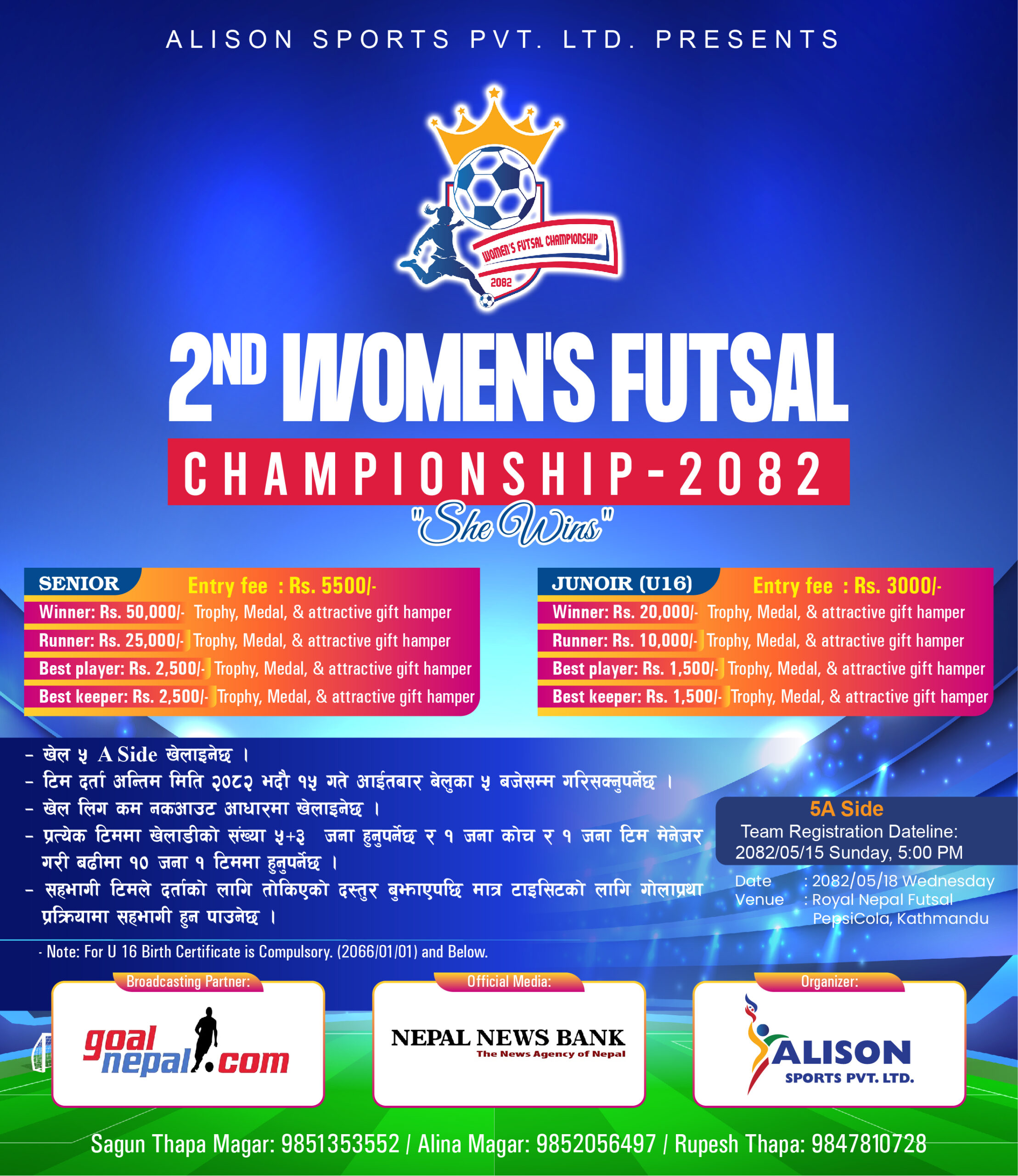 काठमाडौं । एलिसन स्पोट्र्स प्रालिको आयोजनामा काठमाडौंको पेप्सीकोलामा ‘दोस्रो महिला फुटसल च्याम्पियनसिप–२०८२’ आयोजना हुने भएको छ ।