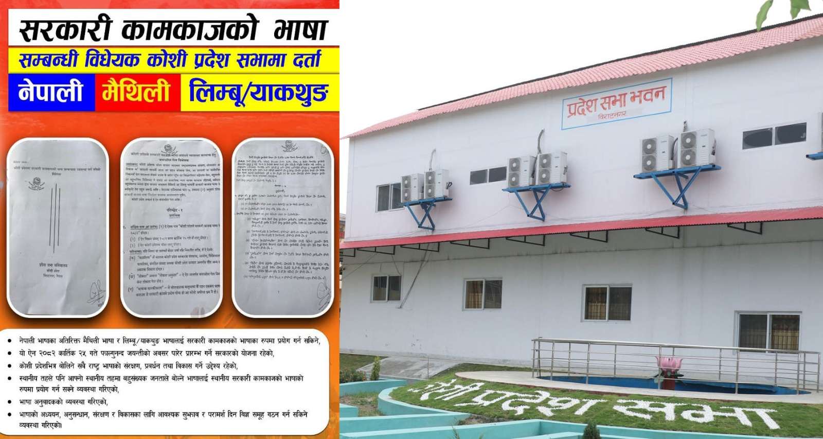 कोशी प्रदेश सरकारले लिम्बु (याक्थुङ) र मैथिली भाषालाई सरकारी कामकाजको भाषाको रूपमा प्रयोगमा ल्याउने उद्देश्यले तयार पारेको विधेयक प्रदेशसभामा दर्ता गरेको छ । संविधानको धारा ७ को उपधारा (२) अनुसार प्रदेशले आफैं प्रयोग गर्ने सरकारी कामकाजको भाषा निर्धारण गर्न सक्ने प्रावधान अनुसार सरकारद्वारा विधेयक अघि सारिएको हो ।