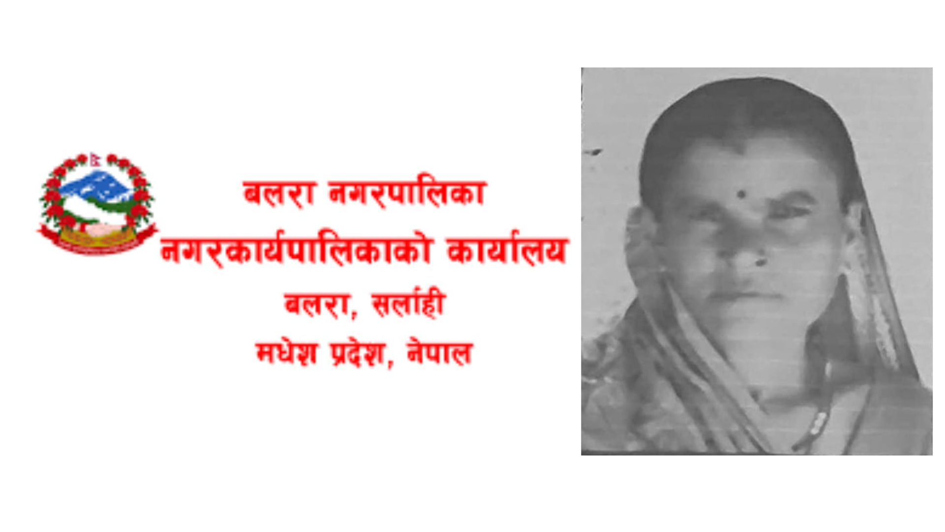 रौतहट । सर्लाहीको बलरा नगरपालिकाले कार्यपालिका सदस्यको निधनमा आज ( आइतबार) एक दिनका लागि शोक बिदा दिएको छ ।