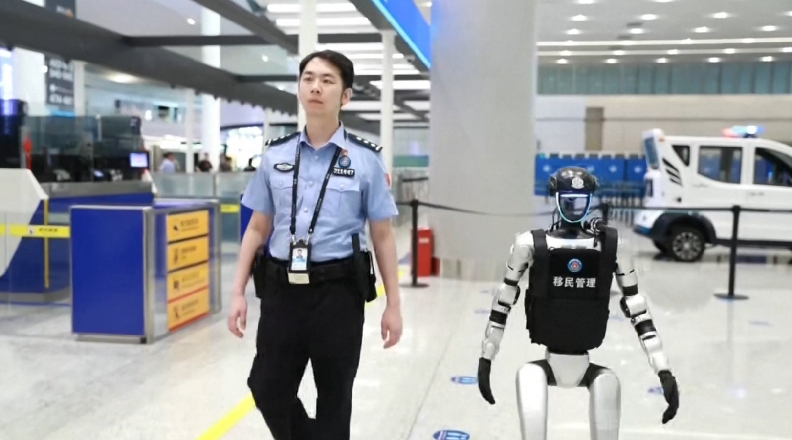 हाङझाउ सियाओशान अन्तर्राष्ट्रिय विमानस्थलको सीमा निरीक्षण क्षेत्रमा, मानवरूपी रोबोटहरू टर्मिनलमा घुम्ने गरेका छन् ।