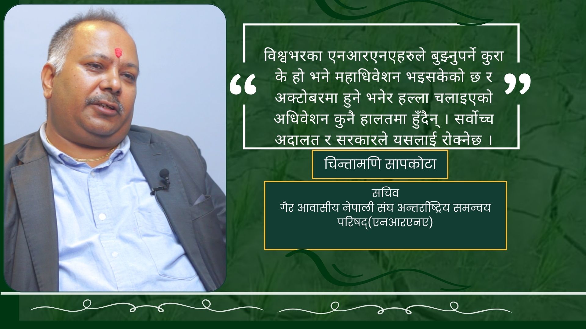 यहाँ पैसावालाको इगो छ । हामी सामाजिक काम गर्नेहरुको मात्र इगो होइन् । यसमा संस्थापक र पूर्वअध्यक्षहरु सबै एक ठाउँमा हुनुपर्छ । उहाँहरुले आत्मसमीक्षा गर्न सक्नुपर्छ । एमाले अध्यक्षले कसैलाई टेको दिएर संस्था फुटाउने प्रयास गर्नुहुँदैन् । महेश श्रेष्ठजी सबैभन्दा बढी संवाद र समन्वय गर्नुपर्छ भन्ने पक्षमा हुनुहुहुन्छ । हामी सबै एकताबद्ध एनआरएनएको पक्षमा छौं । कसैको टेकोको भरमा र अदालतको आदेशलाई अपब्याख्या गरेर समाजलाई भ्रम छर्ने काम चाहीं बन्द हुनुपर्छ । (एनआरएनए एकता महाधिवेशनबाट सचिव पदमा निर्वाचित सापकोटासँग नेपाल न्यूज बैंकसँगको कुराकानीमा आधारित)