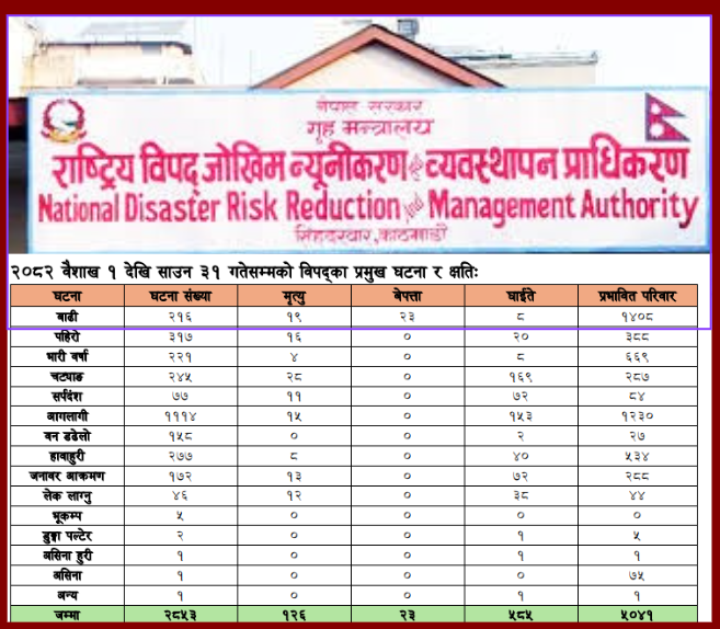 काठमाडौं । गत वैशाखदेखि साउन ३१ गतेसम्म देशभर कुल दुई हजार ८५३ वटा विपद्का घटना घटेका छन्।