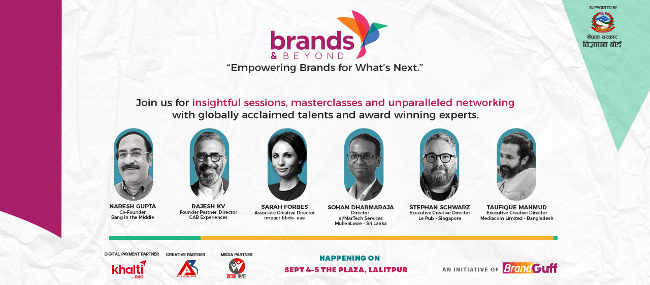 काठमाडौं ।ब्राण्ड बिल्डिङ्ग, ब्राण्ड पोजिसनिङ्ग, मार्केटिङ्ग, स्टोरीटेलिङ्ग सँगै क्रियटिभ दुनियाका व्यवसायिक व्यक्ति तथा जिज्ञासुहरु सहभागी हुने ब्राण्ड्स एण्ड वियोण्ड–२०२५ यही सेप्टेम्बर ४-५ अर्थात भाद्र १९ र २० गते ललितपुरको द प्लाजामा हुने भएको छ ।