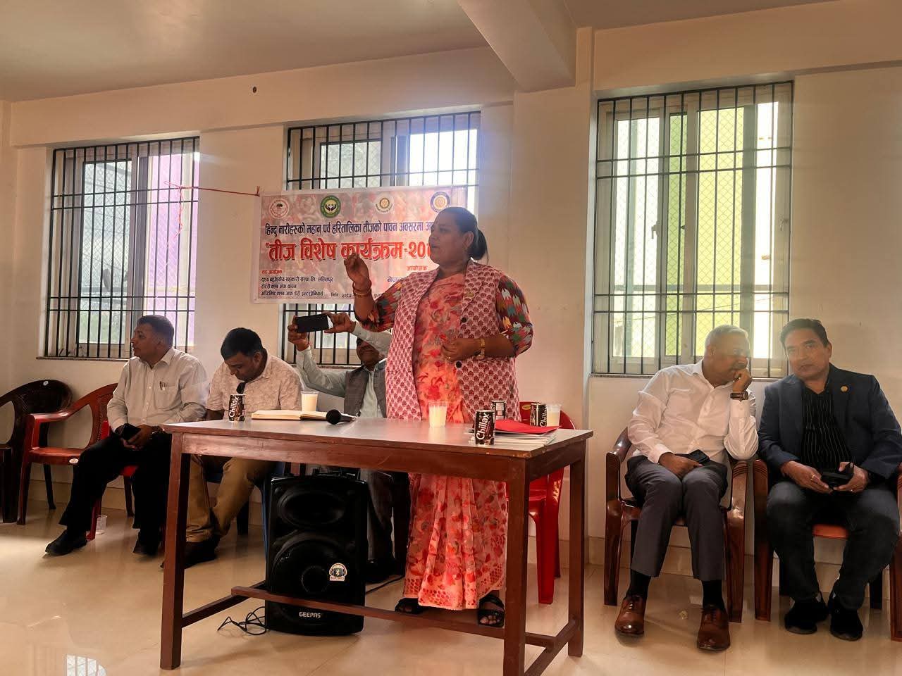 कार्यक्रममा डेरी एसोसिएसनका उपाध्यक्ष मनोज घिमिरेले उपस्थित सबैलाई स्वागत गर्दै कार्यक्रमको उदेश्य बारे प्रष्ट पारेका थिए । कार्यक्रमलाई सम्बोधन गर्दै प्रमुख अतिथि उपसभामुख अपसरा चापागाईंले तीज केवल महिलामात्रको पर्व नभई समाजमा सद्भाव, आपसी सहयोग र सम्मानको सन्देश दिने पर्व भएकाले यसलाई भड्किलो भन्दा सभ्य र मौलिक शैलीमा मनाउनुपर्ने बताइन् ।