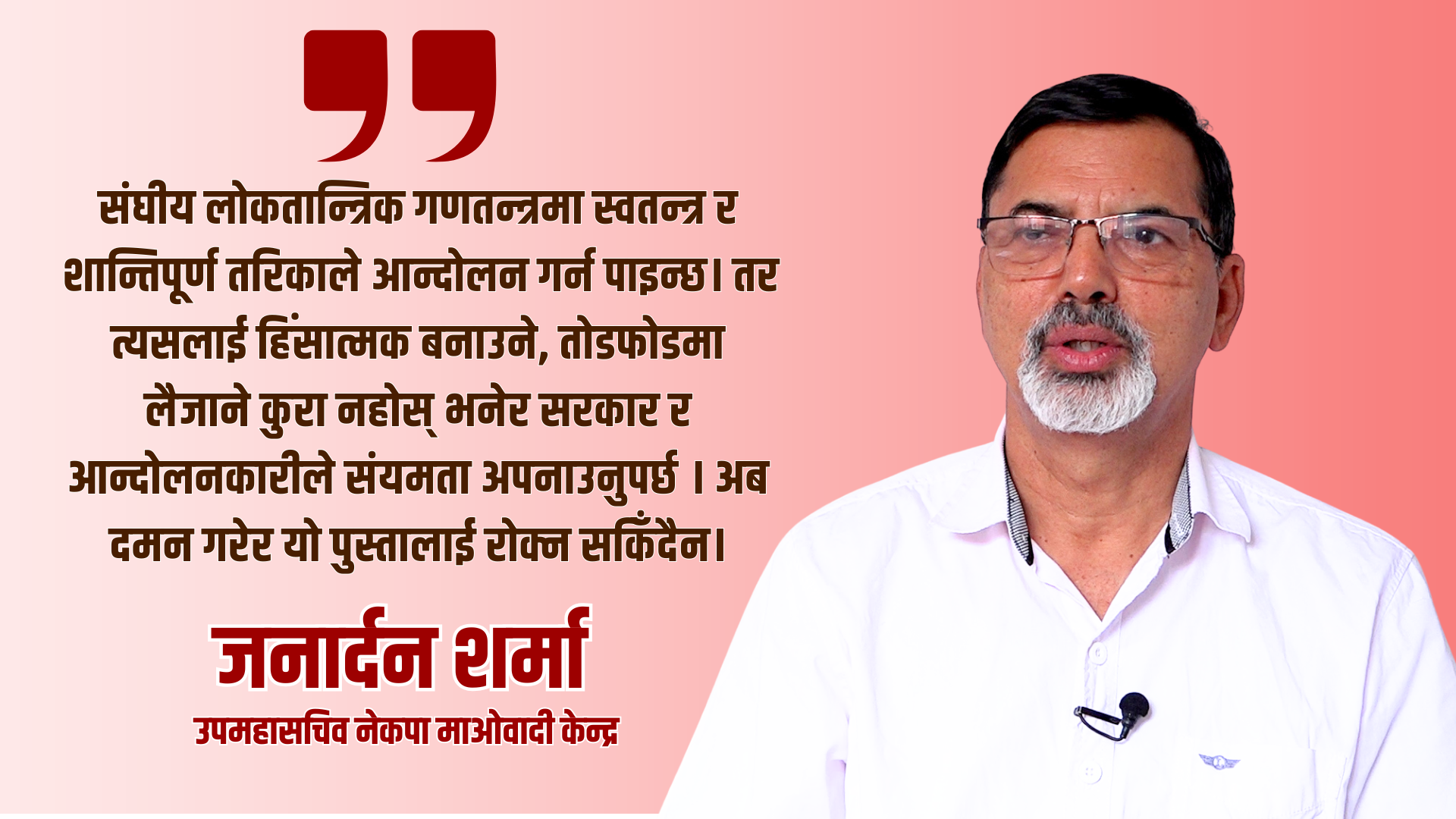सोमबार नेपाल न्यूज बैंकसँगको विशेष कुराकानीमा उपमहासचिव शर्माले जेनजी पुस्ताको आन्दोलनलाई दमन गरेर नभइ कानुनी बाटोमार्फत समाधान खोज्नुपर्ने बताए । आन्दोलनकारीको मागप्रति सरकार गम्भीर भएर समाधानको बाटो पहिल्याउन अपिल समेत गरेका छन् ।