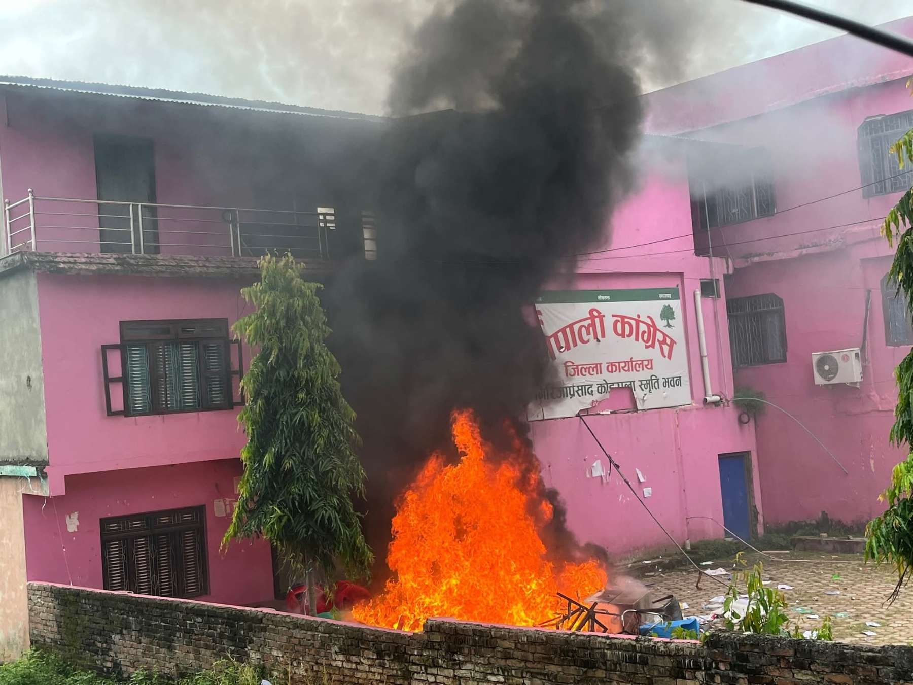 ठूलो भीडले घरमा आगजनी गर्न खोजे पनि त्यहाँ अन्य भाडामा बस्ने मानिसहरू रहेको भन्दै केही प्रदर्शनकारीले विरोध गरेपछि आगो लगाउने प्रयास रोकिने प्रहरी स्रोतले जनाएको छ । भीडले ‘गोली हान्नेलाई कारबाही गर’ भन्दै नाराबाजी समेत गरेको थियो ।
