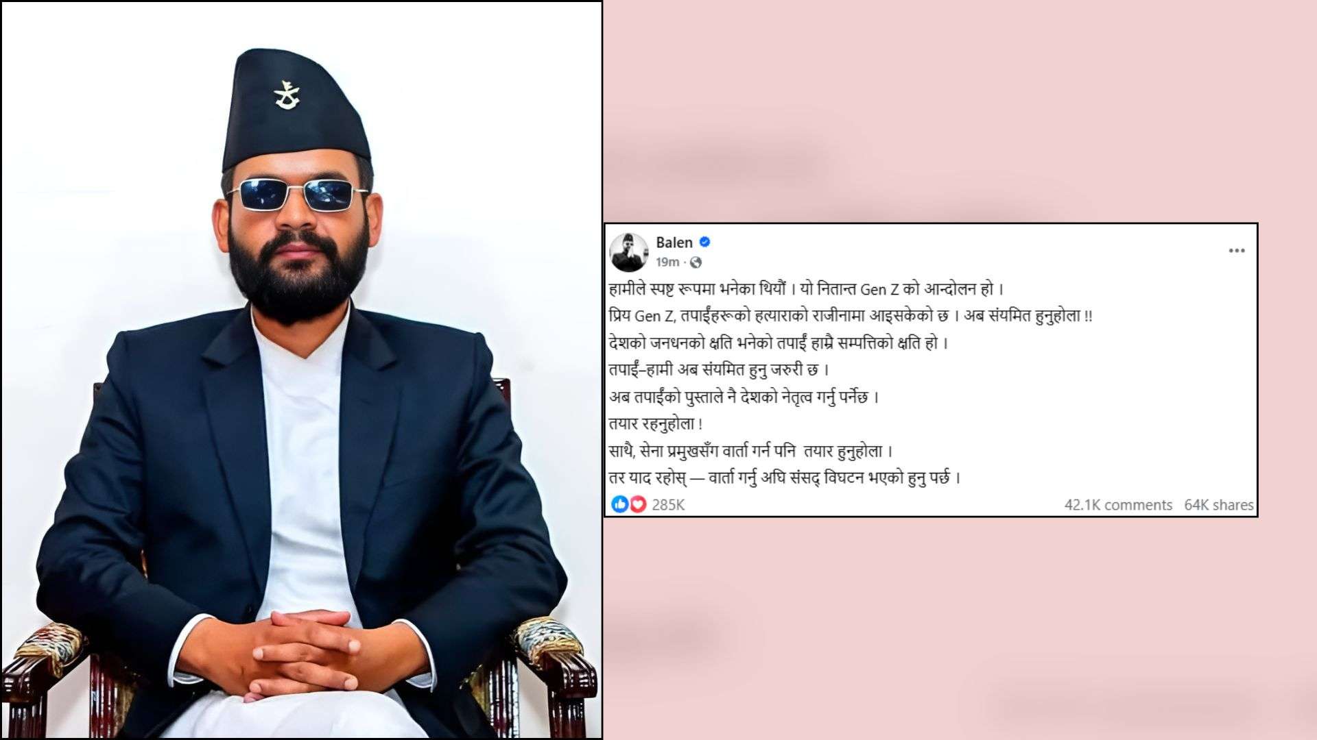 उनले सामाजिक संजालमा लेखेका छन्,‘हामीले स्पष्ट रूपमा भनेका थियौं । यो नितान्त न्भल श् को आन्दोलन हो । प्रिय न्भल श्, तपाईंहरूको हत्याराको राजीनामा आइसकेको छ । अब संयमित हुनुहोला । देशको जनधनको क्षति भनेको तपाईं हाम्रै सम्पत्तिको क्षति हो । तपाईं–हामी अब संयमित हुनु जरुरी छ । अब तपाईंको पुस्ताले नै देशको नेतृत्व गर्नु पर्नेछ । तयार रहनुहोला । साथै, सेना प्रमुखसँग वार्ता गर्न पनि  तयार हुनुहोला ।तर याद रहोस् वार्ता गर्नु अघि संसद् विघटन भएको हुनु पर्छ ।’
