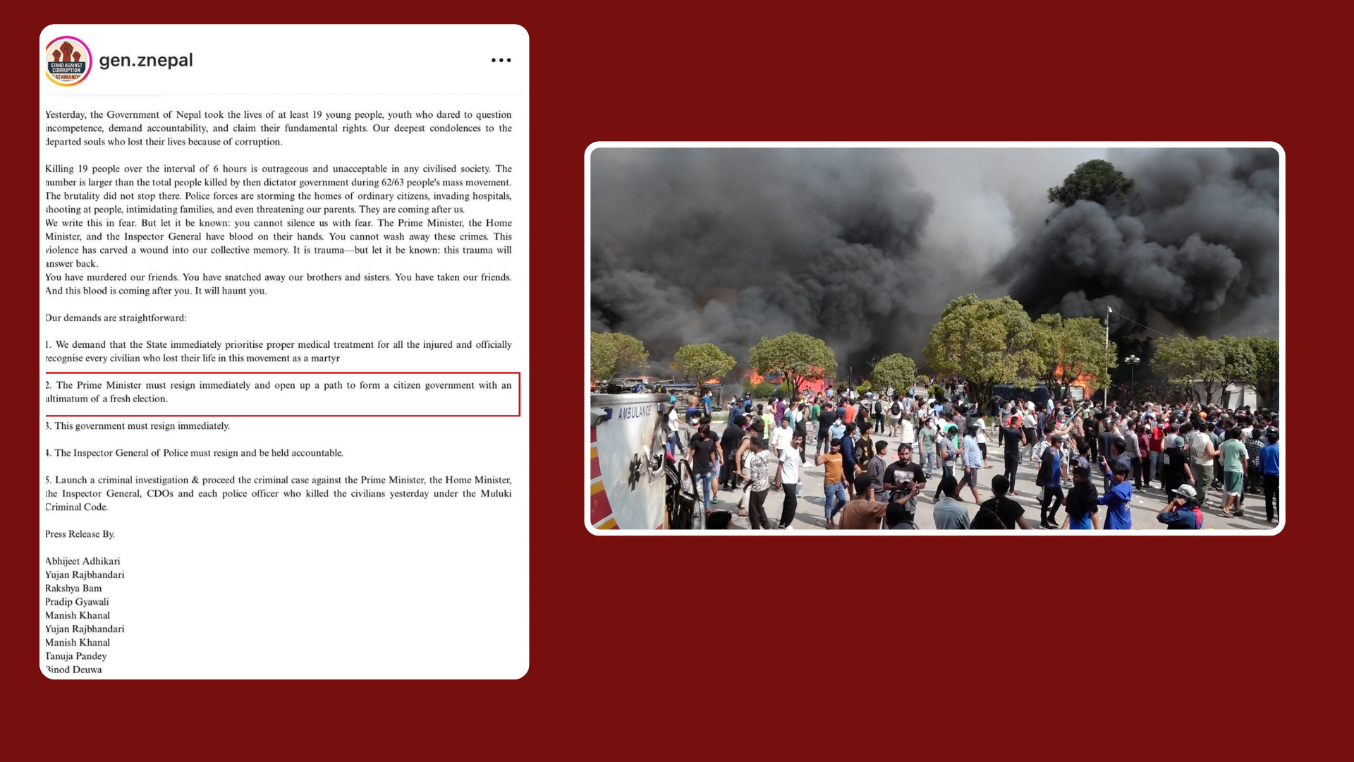 काठमाडौं । जेनजी आन्दोलनका प्रमुख अगुवाहरुले प्रधानमन्त्रीको राजीनामासँगै नयाँ चुनावको अल्टिमेटमसहित नागरिक सरकार गठन गर्ने माग गरेका छन् ।