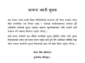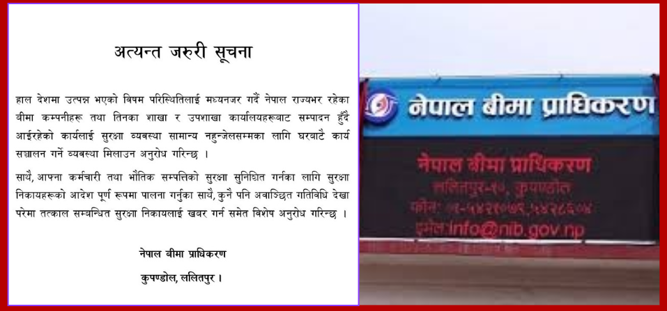 प्राधिकरणले आज एक सूचना जारी गर्दै सुरक्षाको अवस्था सामान्य नहुँदासम्म सबै बीमा कम्पनी तथा तिनका शाखा र उपशाखा कार्यालयहरूलाई वर्क फ्रम होम (घरबाट कार्य सञ्चालन) को व्यवस्था मिलाउन अनुरोध गरेको हो ।