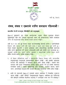 १. यो विषम परिस्थितिमा वार्ता र संवादमार्फत निकास दिनका लागि सम्माननीय राष्ट्रपतिज्यूले लिनुभएको पहलकदमीको स्वागत गर्दछौं । सबै पक्षसँग आवश्यक परामर्श गरी संवादबाट नै समाधान खोज्न हामी आग्रह गर्दछौं । नेपाली सेना लगायत सबै सुरक्षा निकायहरूले शान्ति सुरक्षा कायम गर्न आ–आफ्नो स्थानबाट गरिरहेको प्रयास र संवाद प्रक्रियालाई आम नागरिक, नागरिक समाज, संचार जगत, अन्तराष्ट्रिय समुदाय सबै तहबाट पनि साथ–सहयोगका लागि अपील गर्दछौं।