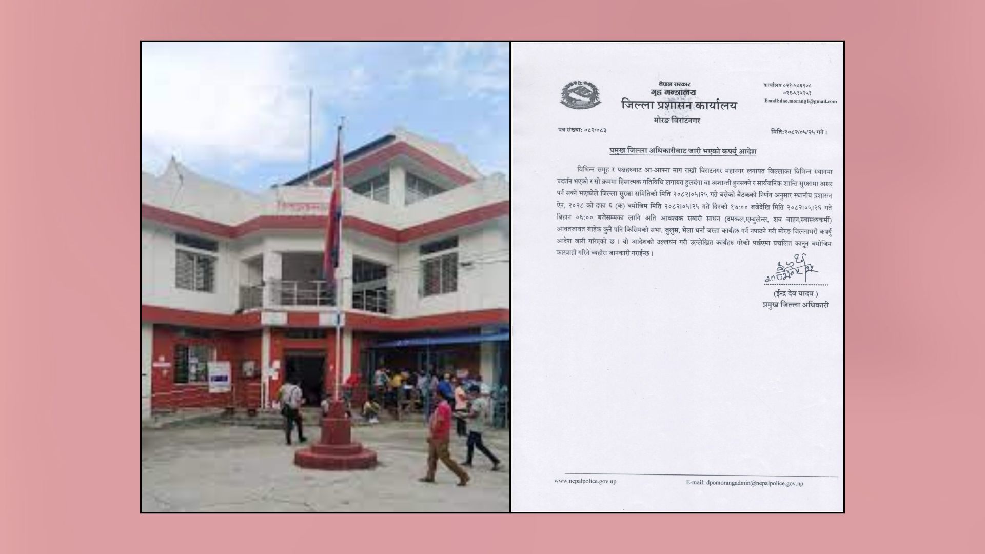 प्रशासनले जारी गरेको आदेशअनुसार मिति २०८२ भदौ २५ गते साँझ ५ बजेदेखि भदौ २६ गते बिहान ६ बजेसम्म मोरङ जिल्लाभर कफ्र्यू लागु हुनेछ ।