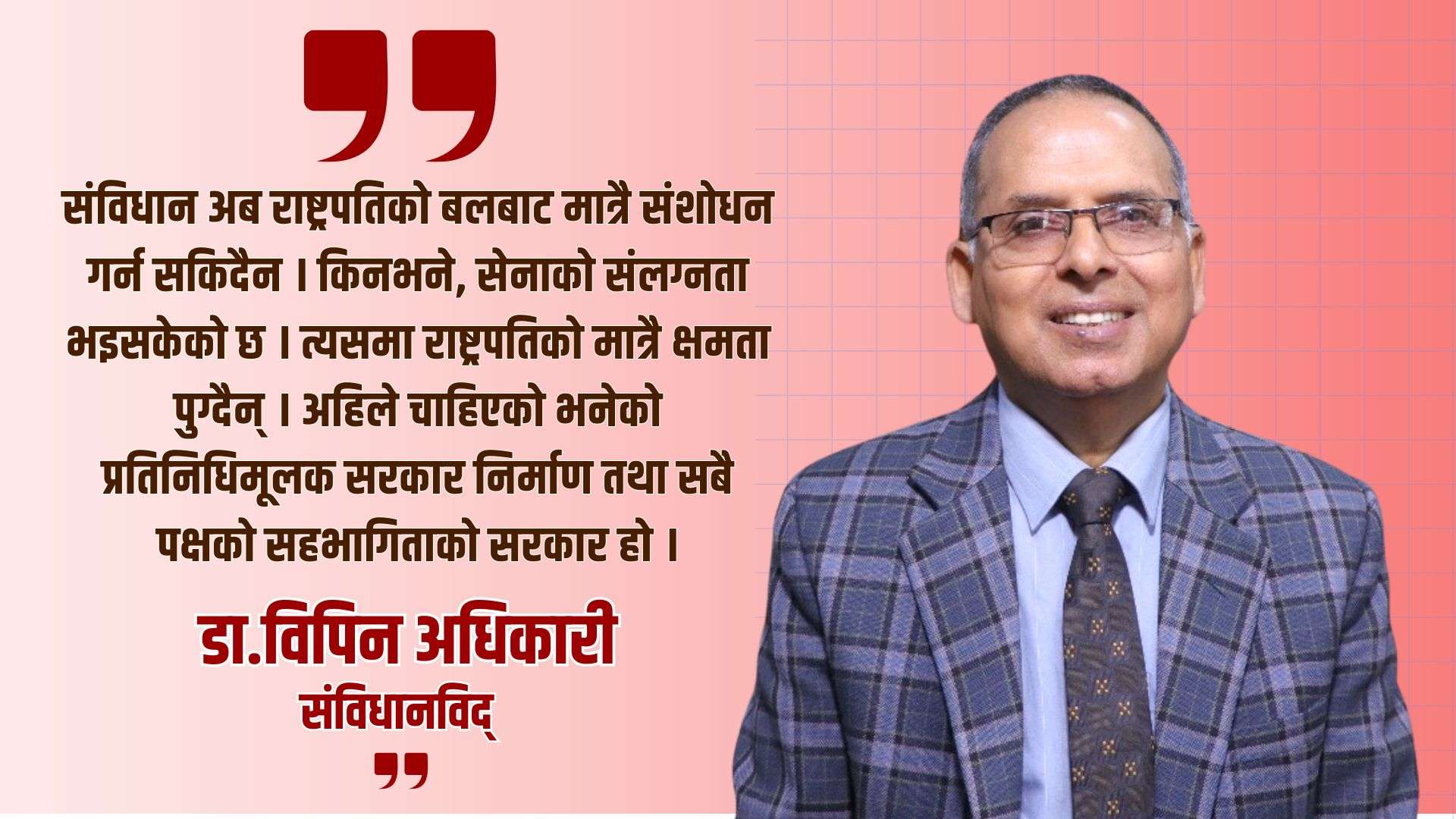 संविधान अब राष्ट्रपतिको बलबाट मात्रै संशोधन गर्न सकिदैन । किनभने, सेनाको संलग्नता भइसकेको छ । त्यसमा राष्ट्रपतिको मात्रै क्षमता पुग्दैन् । अहिले चाहिएको भनेको प्रतिनिधिमूलक सरकार निर्माण तथा सबै पक्षको सहभागिताको सरकार हो ।
