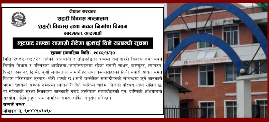 विभागले सूचना निकाल्दै जेनजी आन्दोलनका क्रममा यही भदौ २४ गते बबरमहलस्थित भवन निर्माण विभागमा व्यापक लुटपाट भएकोले सामान फिर्ता गर्न अनुरोध गरेको हो ।