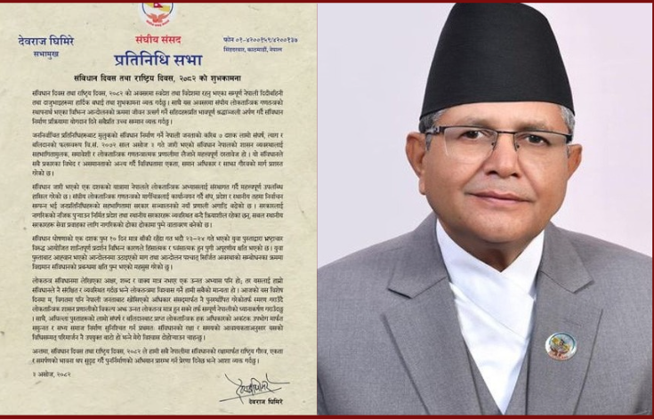 काठमाडौं । संविधान दिवस तथा राष्ट्रिय दिवस २०८२ को अवसरमा संघीय संसद प्रतिनिधिसभाका सभामुख देवराज घिमिरेले शुभकामना सन्देश जारी गरेका छन् । सन्देशमार्फत सभामुख घिमिरेले स्वदेश तथा विदेशमा रहेका सम्पूर्ण नेपाली दिदीबहिनी तथा दाजुभाइहरूमा हार्दिक बधाई तथा शुभकामना व्यक्त गरेका छन् ।