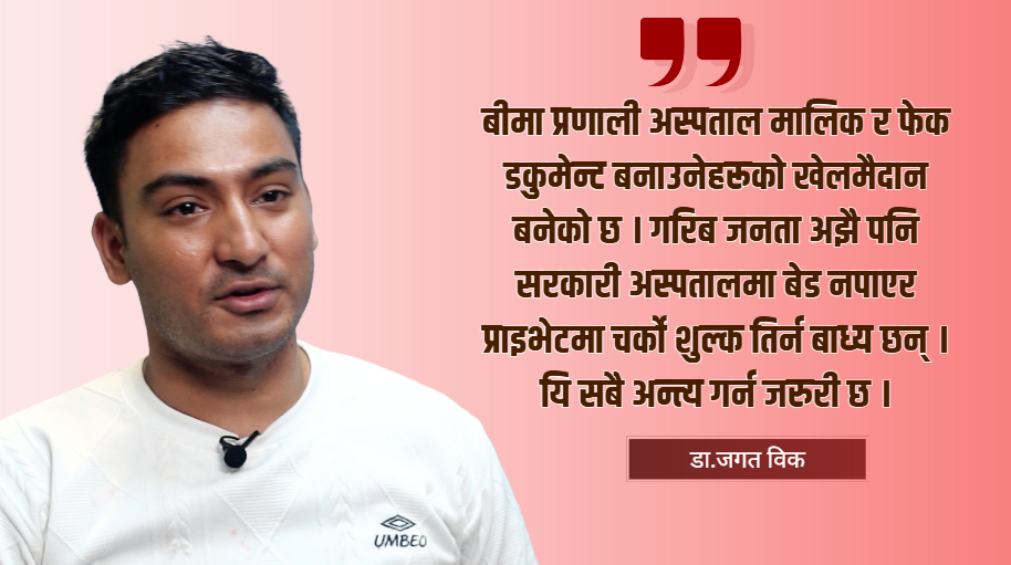 बीमा प्रणाली अस्पताल मालिक र फेक डकुमेन्ट बनाउनेहरूको खेलमैदान बनेको । गरीब जनता अझै पनि सरकारी अस्पतालमा बेड नपाएर प्राइभेटमा चर्को शुल्क तिर्न बाध्य छन् । यि सबै अन्त्य गर्न जरुरी छ ।
