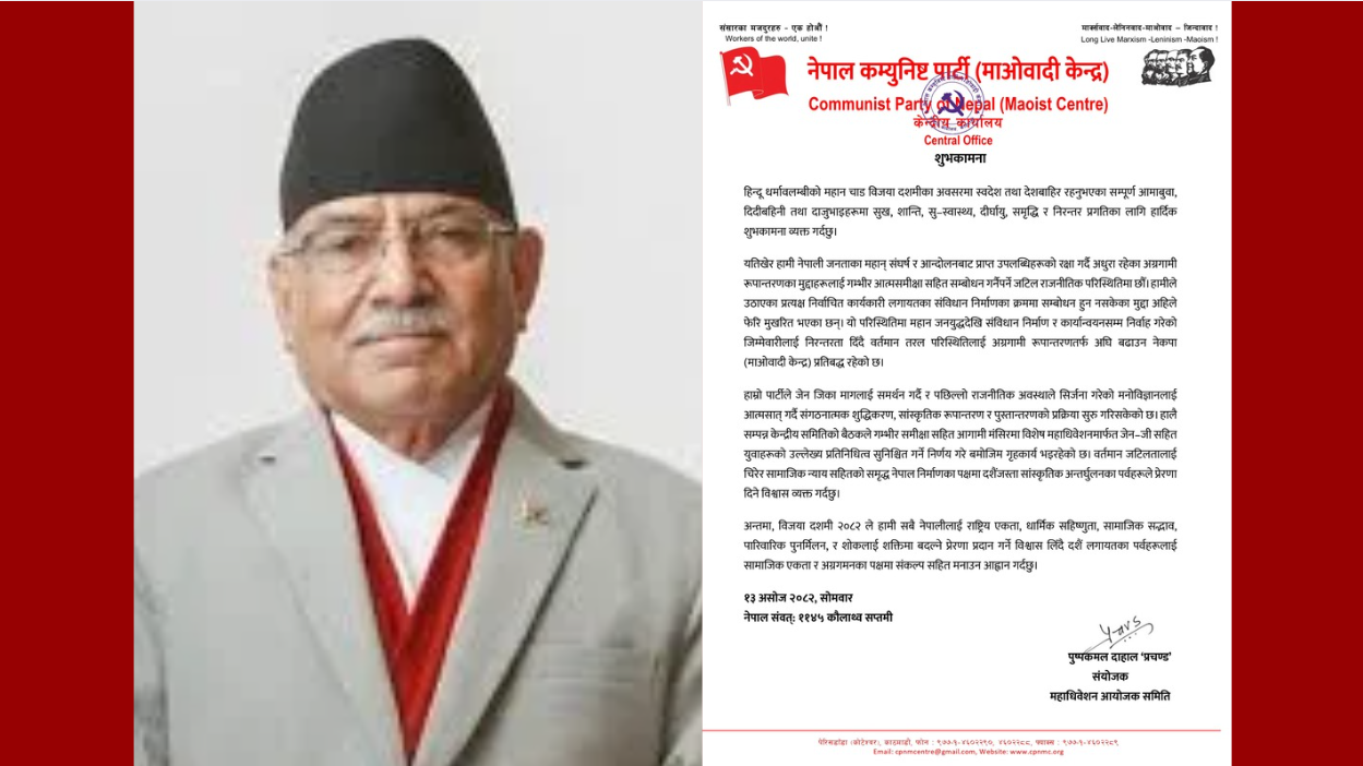 काठमाडौं । नेकपा माओवादी केन्द्रका अध्यक्ष पुष्पकमल दाहाल ‘प्रचण्ड’ ले विजया दशमीका अवसरमा स्वदेश तथा देशबाहिर रहेका सम्पूर्णमा शुभकामना व्यक्त गरेका छन् ।