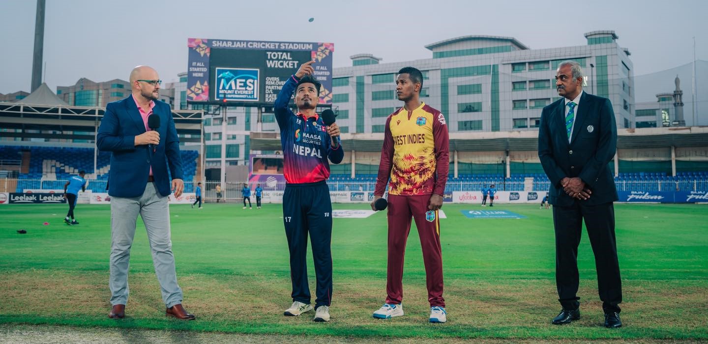 युएईको शारजहाँ क्रिकेट रंगशालामा वेस्ट इन्डिजका कप्तान अकिल होसेनले टस जितेर फिल्डिङको निर्णय लिए ।