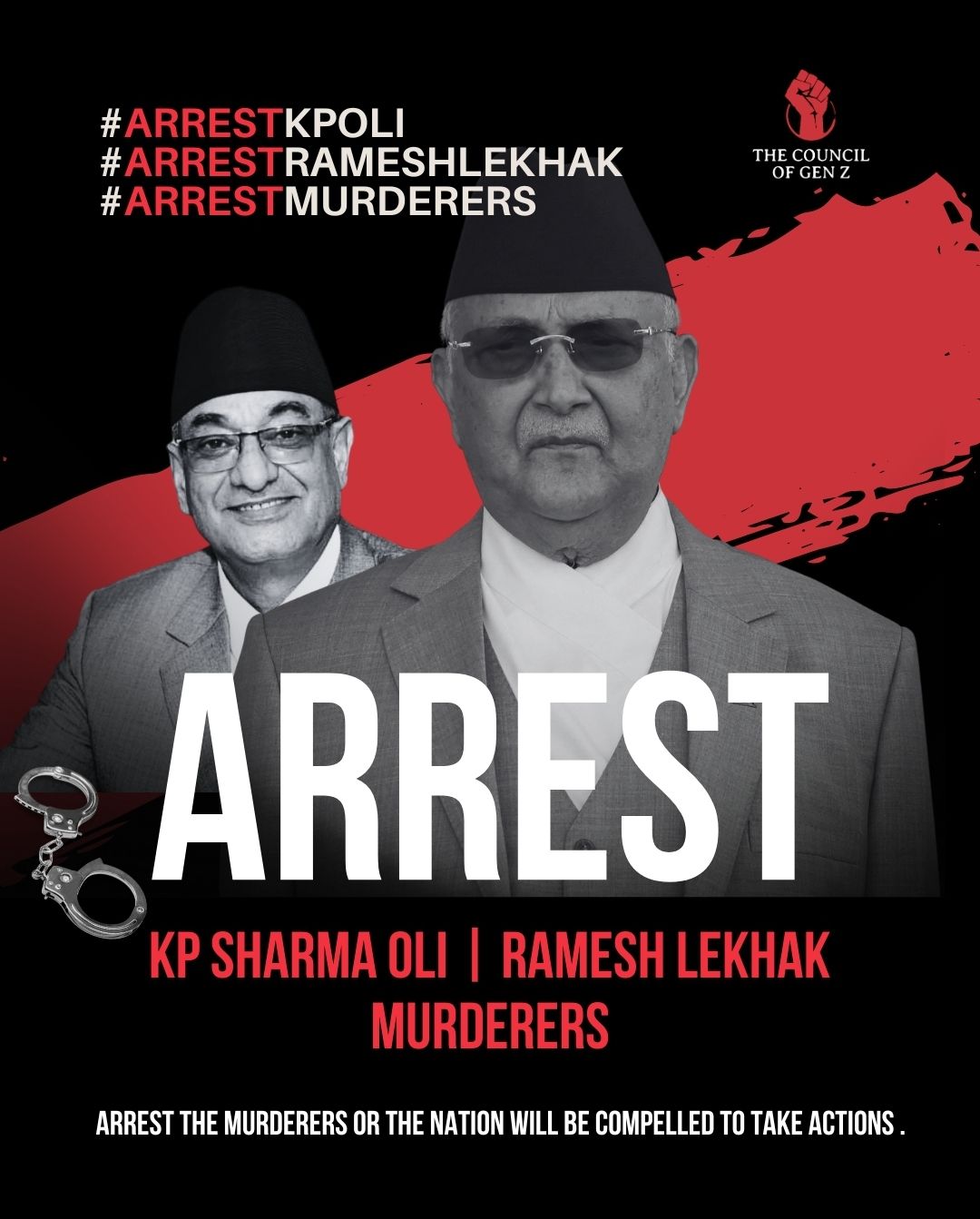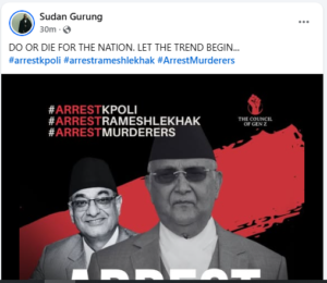 यसैबीच, सुदन गुरुङले सार्वजनिक गरेको ‘एरेष्ट क्याम्पेन’मा तत्कालै पक्राउ गर्न माग गरिएको छ। उनले चेतावनी दिँदै भनेका छन्, “यदि तत्काल कारबाही भएन भने राष्ट्र आफैं एक्सनमा उत्रनेछ।”