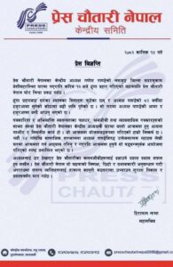 विज्ञप्तिमा अगाडि भनिएको छ,‘अध्यक्षलाई डर देखाएर प्रेस चौतारीका कलमजीवीहरूलाई दबाउने प्रयास प्रयास सफल हुन सक्दैन । प्रेस चौतारी नेपाल यो घटनाको निष्पक्ष, छिटो र प्रभावकारी अनुसन्धान गरी अपराधमा संलग्न व्यक्तिहरूलाई तत्काल कानूनी कठघरामा उभ्याउन सुरक्षा निकाय र हलाई तत्काल कार्यनी कठपरामा उभ्याउन सुरक्षा निकाय प्रशासनसँग माग गर्दछ ।’