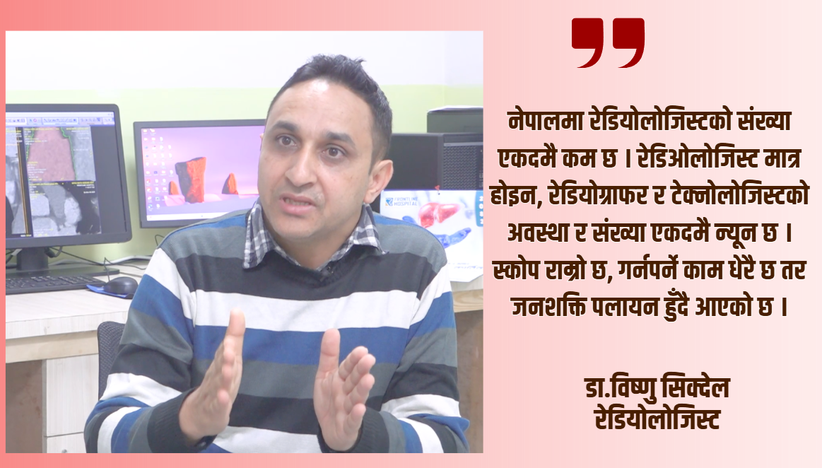अहिले नेपालमा रेडियोलोजिस्टको संख्या तीनदेखि पाँच सयको हाराहारीमा होला । रेडियोलोजिस्टहरू एकदमै कम छन् । रेडिओलोजिस्ट मात्र होइन, रेडियोग्राफरहरूको पनि संख्या कम छ । स्कोप राम्रो भएपनि जनशक्ति कम छ । तर फिल्डबाट जनशक्ति पलायन हुने अवस्था देखिएको छ । पारिश्रमिक न्यून भएका कारण जनशक्ति टिक्न सकिरहेको छैन् । यसको मुख्य कारण भनेको पारिश्रमिक नै हो । उहाँहरूले यहाँ कमाएको भन्दा बाहिर धेरै कमाउनुहुन्छ । त्यति नै मेहेनत गरेर यहाँ किन बस्ने भन्ने हुन्छ । त्यही भएर पनि प्राय बाहिर पलायन भएको अवस्था छ ।