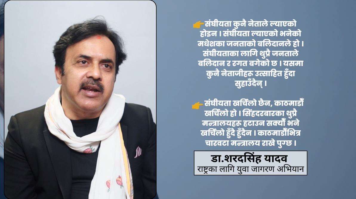 संघीयता कुनै नेताले ल्याएको होइन् । संघीयता ल्याएको भनेको मधेशका जनताको बलिदानले हो । संघीयताका लागि थुप्रै जनताले बलिदान र रगत बगेको छ । यसमा कुनै नेताजीहरू उत्साहित हुनु भनेको त्यति सुहाउँदैन् । जुन जनताले संघीयता ल्याए, त्यही जनताले संघीयता बचाउने हो । त्यही जनताले अब आगामी दिनमा त्यस्ता व्यक्तिहरू चुनेर पठाउँदैन । सही व्यक्ति र युवाहरूलाई, पढेलेखेका युवाहरूले पठाउँछन् र उसले संघीयतालाई अझै सशक्त रूपमा अगाडि बढाउँछ, सबल बनाउँछ र प्रदेशलाई समृद्ध बनाउँछ ।
