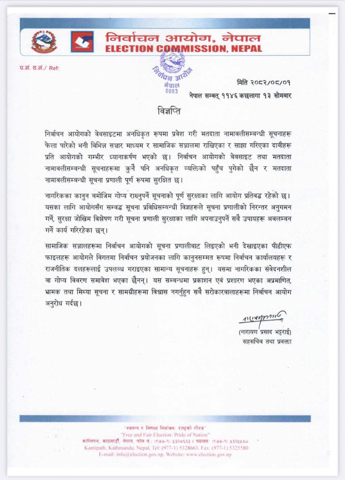 एक विज्ञप्ती जारी गर्दै आयोगले वेबसाइटबाट मतदाता नामावलीसम्बन्धी कुनै पनि व्यक्तिगत विवरण नचुहिएको र सूचना प्रणाली पूर्ण रूपमा सुरक्षित रहेको आयोगले जनाएको छ । आयोगले हाल प्रयोग भइरहेका सबै सूचना प्रवाह तथा सुरक्षासम्बन्धी संयन्त्रहरू नियमित अनुगमनमा रहेको र कुनै पनि संवेदनशील सूचना लीक हुन नदिने गरी आवश्यक प्रबन्ध मिलाइएको जनाएको छ।