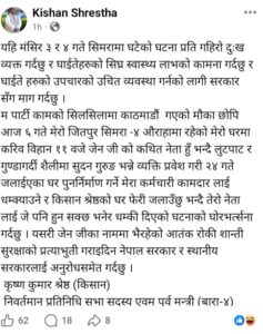 उनले सामाजिक संजाल फेसबुकमा जितपुरसिमरा उपमहानगरपालिका–४ औराहास्थित आफ्नो जलेको घरमा सुदन गुरुङ प्रवेशगरी धम्कीपूर्ण व्यवहार गरेको लेखेका छन् ।