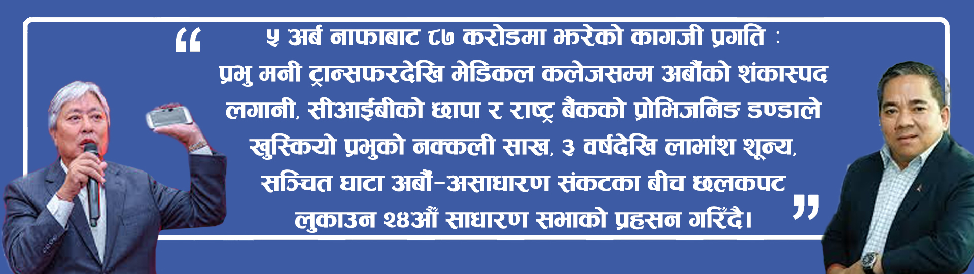 अपरिस्कृत वित्तीय विवरणमा १ अर्ब ४ करोड ५१ लाख रुपैयाँ सञ्चित नाफा देखाउँदै ४.४४ प्रतिशत लाभांश क्षमता दाबी गरेको प्रभु बैंक, बाह्य लेखापरीक्षणपछि भने साढे २ अर्ब रुपैयाँभन्दा बढी सञ्चित नोक्सानीमा पुगेको तथ्य बाहिरिएको छ। कागजमा नाफा, लेखापरीक्षणमा घाटा—प्रभु बैंकको वित्तीय अवस्थामाथि गम्भीर प्रश्न खडा भएको छ। यस्तै झट, छल कपट, लुट फरेबको सेरोफेरो बीच एउटा असाधारण साधारण सभा, आफ्नो चौबिसौ बार्षिक साधारण सभा आयोजना गर्दै छ प्रभु बैंक :
