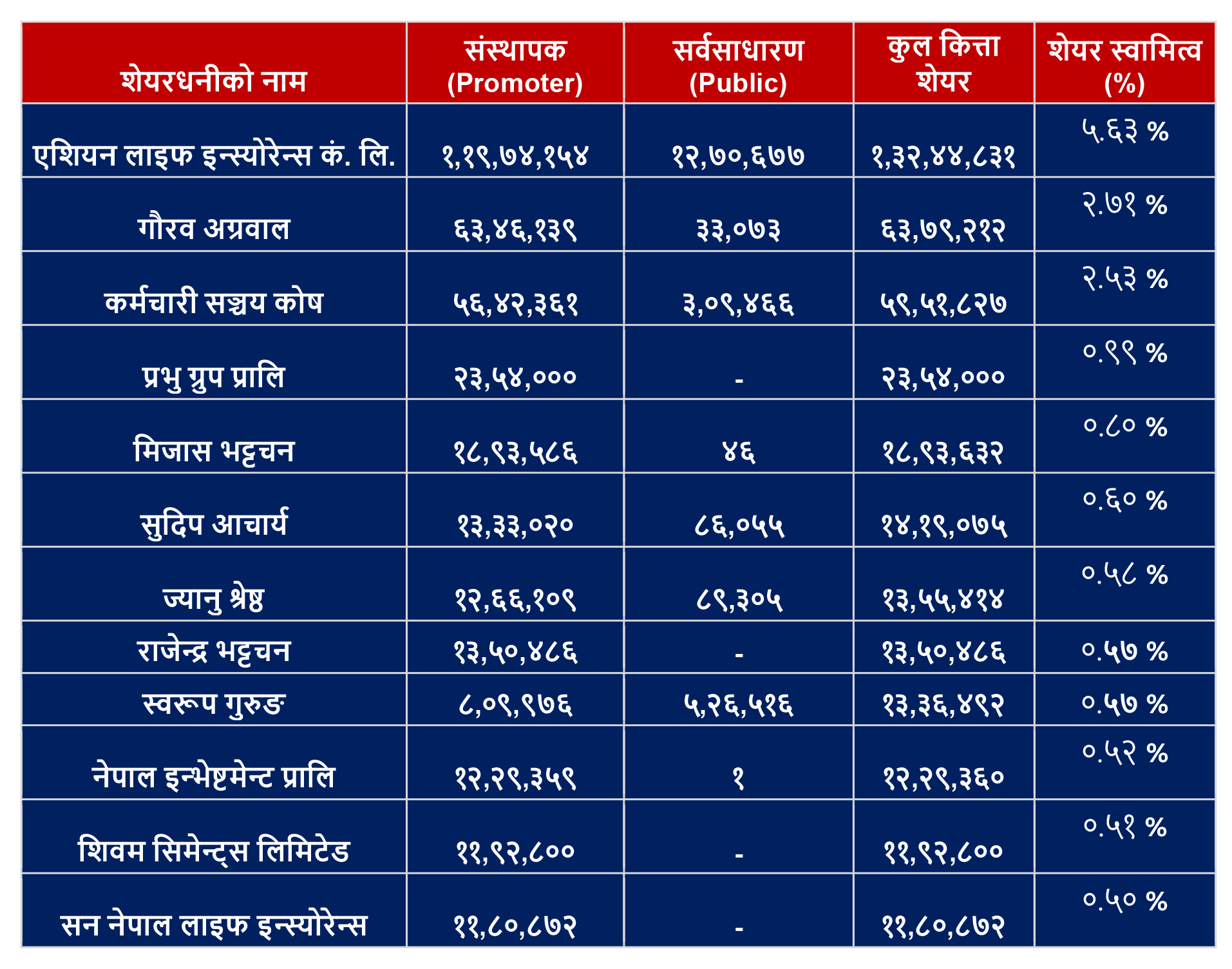 बैंकको कुल शेयरमध्ये .% भन्दा बढी स्वामित्व भएका मुख्य शेयरधनीहरूको सूची निम्नानुसार छ:
