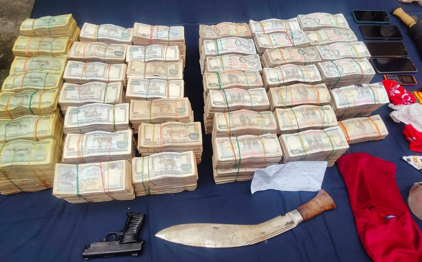 प्रहरीले हालसम्म २ करोड ६६ लाख ५५ हजार १ सय ७५ रुपैयाँ नगद, दुई थान खुकुरी, एक थान नक्कली प्लास्टिकको पेस्तोल, पाँच थान मोबाइल, नकाब तथा अन्य सामग्री बरामद गरेको छ ।