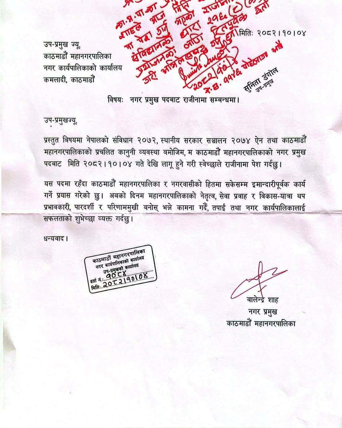 काठमाडौं महानगरपालिकाका मेयर बालेन शाहले पदबाट राजीनामा दिएका छन् । उनले उपमेयर सुनिता डंगोललाई आइतबार राजीनामा बुझाएको काठमाडौं महानगरपालिकाका प्रवक्ता नविन मानन्धरले नेपाल न्यूज बैंकलाई जानकारी दिएका छन् ।
