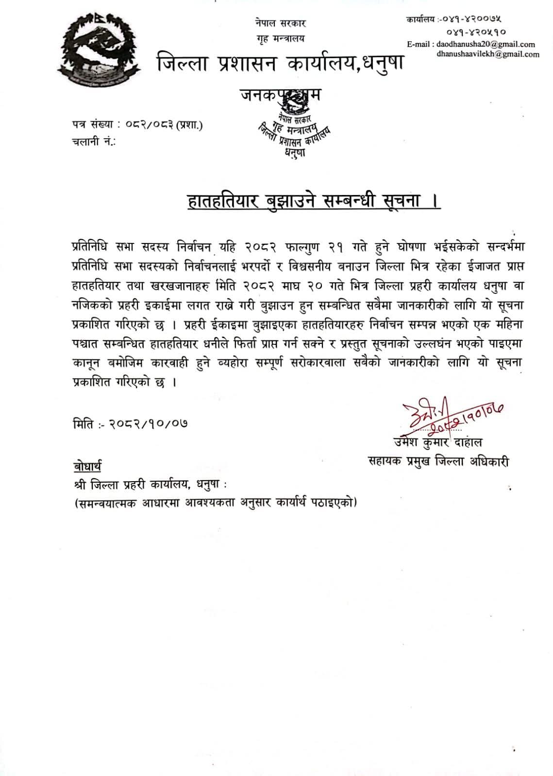 जिल्ला प्रशासन कार्यालय धनुषाले आज एक सुचना जारी गर्दै आगामी २०८२ फागुन २१ गते हुने प्रतिनिधि सभा सदस्य निर्वाचनलाई मध्यनजर गर्दै इजाजत प्राप्त हातहतियार तथा खरखजाना २०८२ माघ २० गतेभित्र जिल्ला प्रहरी कार्यालय धनुषा वा नजिकको प्रहरी इकाइमा बुझाउन आग्रह गरेको छ ।