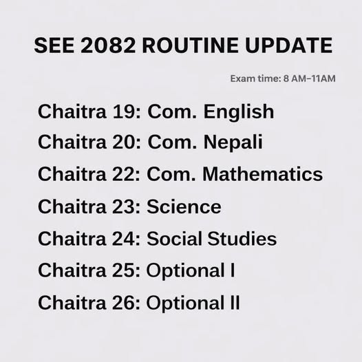 कक्षा १० को माध्यमिक शिक्षा परीक्षा (एसईई) चैत १९ देखि २९ गतेसम्म सञ्चालन हुने भएको छ । शैक्षिक क्यालेन्डरअनुसार परीक्षा पहिलो साता हुनुपर्ने भए पनि निर्वाचनका कारण मिति परिवर्तन गरिएको हो ।