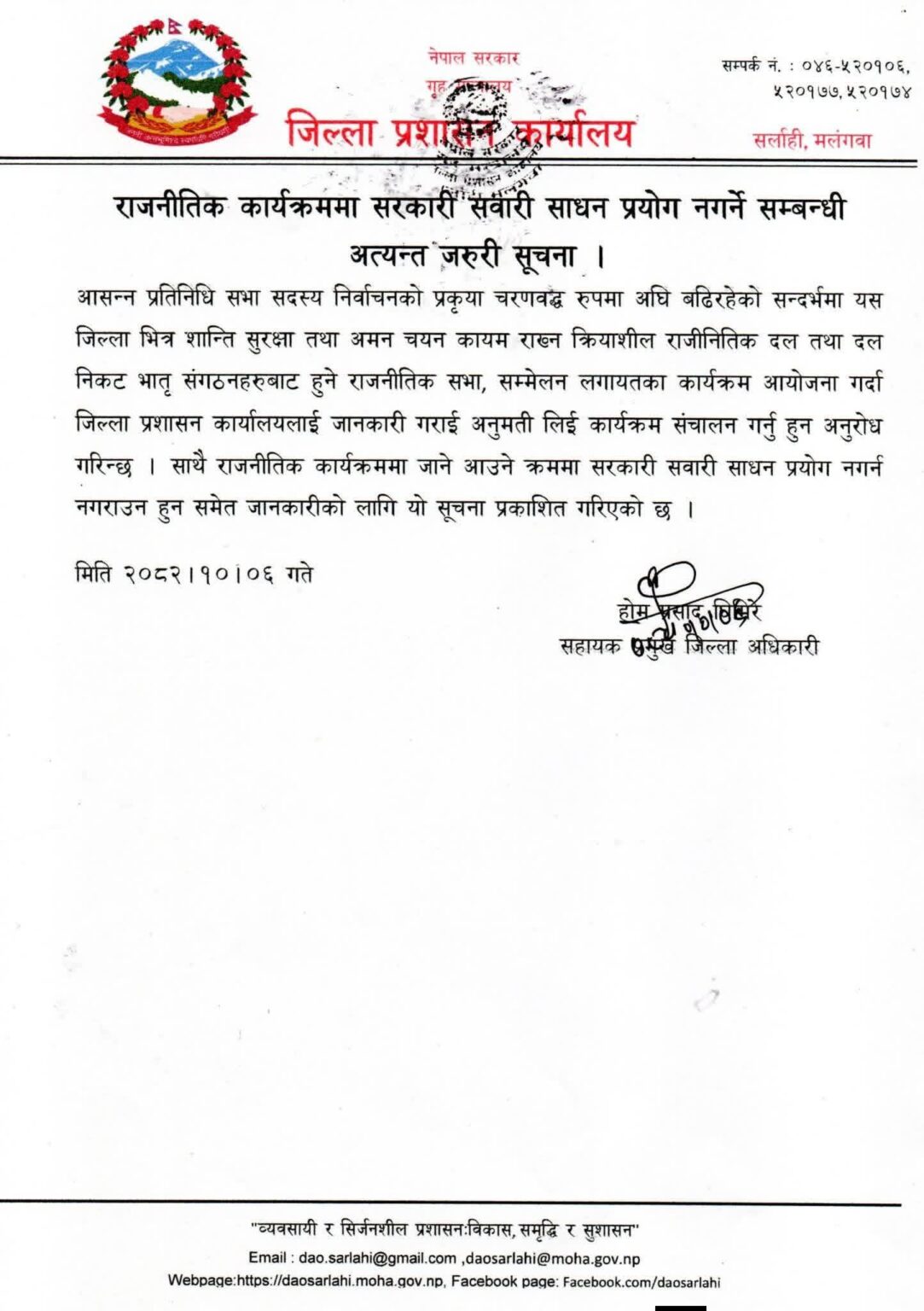 राजनीतिक कार्यक्रममा सरकारी सवारी साधन प्रयोग नगर्न सर्लाही प्रशासनको आग्रह