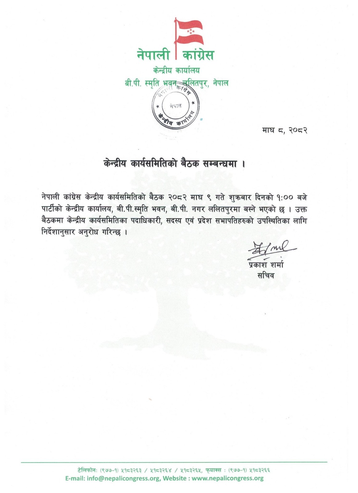 विहीबार भने कांग्रेस केन्द्रीय कार्यसमितिको बैठक आह्वानसम्बन्धी सूचना पार्टी सचिव प्रकाश शर्माद्वारा कांग्रेसको आधिकारिक फेसबुक पेजमार्फत सार्वजनिक गरिएको हो ।सूचनाअनुसार केन्द्रीय कार्यसमितिको बैठक शुक्रबार दिउँसो १ बजे पार्टीको केन्द्रीय कार्यालय बीपी स्मृति भवन, बीपी नगर, ललितपुरमा बस्नेछ ।