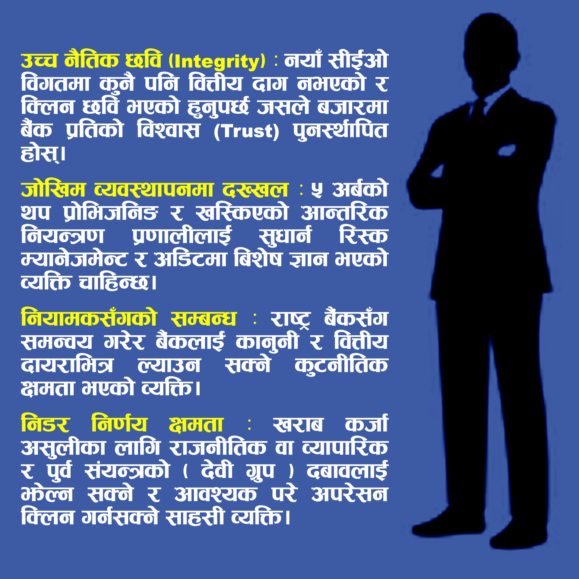 हाल देखिएको संचित घाटा, बढ्दो जोखिम सूचकहरू र कानुनी जटिलताबाट संस्थालाई बाहिर निकाल्न सक्षम नेतृत्वको आवश्यकता छ। त्यसका लागि बैंक भित्रको आन्तरिक समीकरणभन्दा बाहिरबाट आउने, संस्थागत पुनर्संरचना (institutional turnaround) अनुभव भएको, नियामकीय अनुपालन र कडा सुशासनमा स्पष्ट प्रतिबद्धता राख्ने प्रोफेशनल सीईओ उपयुक्त विकल्प हुनसक्छ।