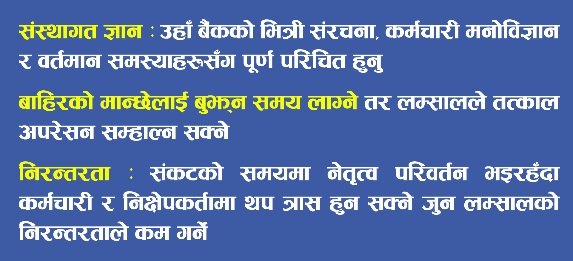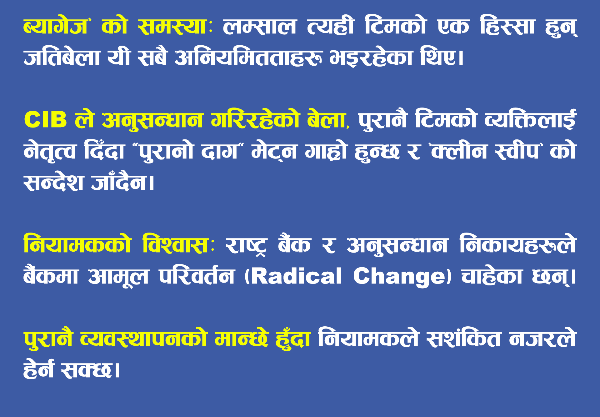 यस्तो नेतृत्वले मात्र जोखिम व्यवस्थापन सुदृढ गर्ने, विश्वास पुनःस्थापित गर्ने र बैंकलाई स्थिरताको दिशामा लैजाने आधार तयार पार्नसक्छ।