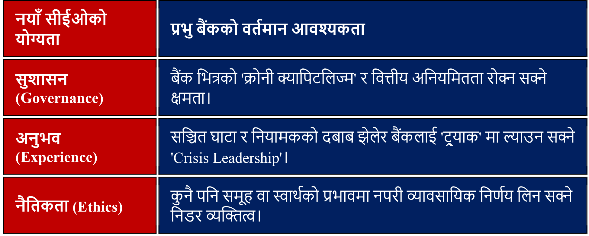 अहिलेको संकटग्रस्त अवस्थामा प्रभु बैंकको बोर्डले ‘रेगुलर ‘ वा ‘मार्केटिङ ओरिएन्टेड’ सीईओ होइन, एक ‘Crisis Manager’ खोज्नु पर्छ। नयाँ सीईओमा निम्न गुणहरू अनिवार्य छन्: