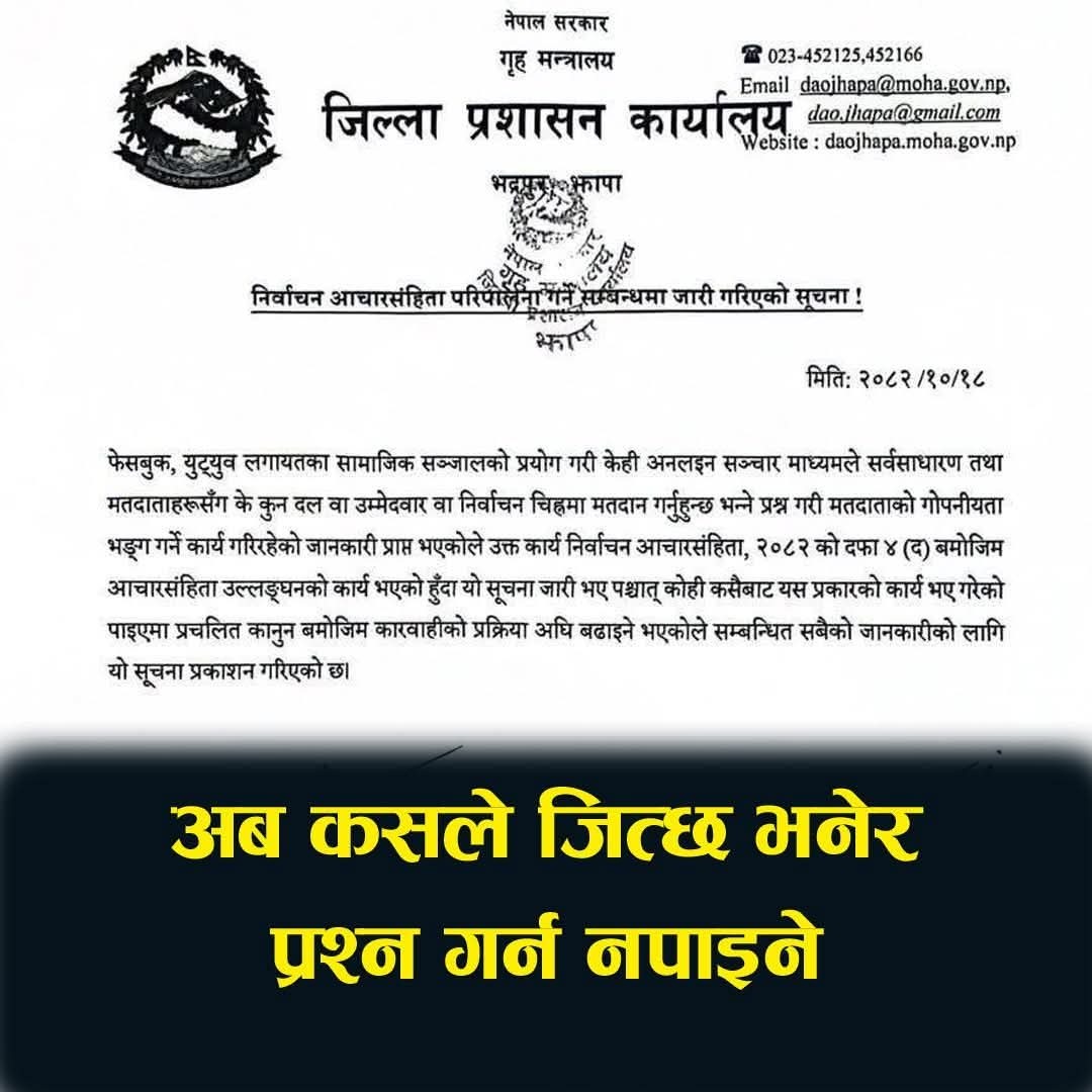 जिल्ला प्रशासन कार्यालयले यस प्रकारको कार्य निर्वाचन आचारसंहिता, २०८२ को दफा ४ (द) अनुसार उल्लङ्घन हुने भएकाले यस्तो नगर्न आग्रह गरेको छ । प्रशासन कार्यालय झापाले सूचना जारी भएपश्चात पनि यस प्रकारको कार्य भएमा प्रचलित कानुन अनुसार कारबाही गरिने जनाएको छ ।