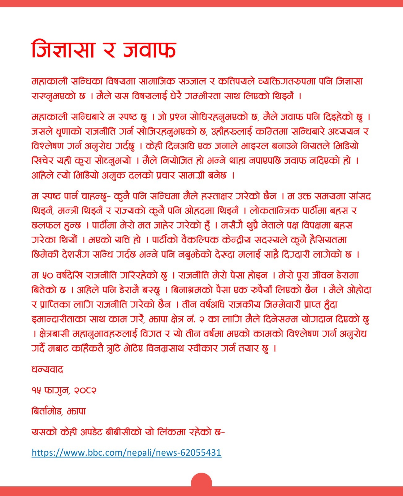 झापा क्षेत्र नं. २ का प्रतिनिधिसभा सदस्यका उम्मेदवार देवराज घिमिरेले महाकाली सन्धिका विषयमा उठिरहेका जिज्ञासाबारे स्पष्टोक्ति दिएका छन् । सामाजिक सञ्जाल तथा व्यक्तिगत रूपमा सोधिएका प्रश्नलाई लिएर उनले आफूले उक्त सन्धिमा कुनै पनि रूपमा हस्ताक्षर नगरेको दाबी गरेका हुन् ।